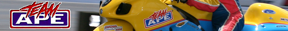 TEAM APE members must have the special Team APE sticker prominently displayed on both sides of the bodywork of the race vehicle throughout the entire season. It should be placed so that it shows well in all photos. (Drag racers... TEAM APE stickers cannot be placed on wheelie bar panels. They must be placed on the rear fender or fairing only.) TEAM APE members must keep APE informed of their racing accomplishments.  The inclusion of photos is optional, but it will help promote members' racing efforts. Members are wecome to link to the Team APE website to further promote their racing efforts.